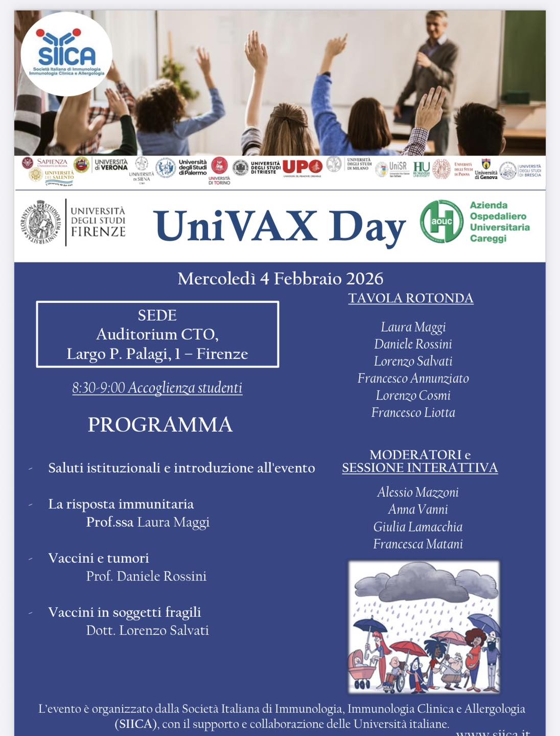 Mercoledì 4 febbraio 2026 si è tenuto a Firenze, presso l’Auditorium CTO, l’evento UniVAX Day, manifestazione nazionale, rivolta agli studenti delle scuole secondarie di secondo grado, promossa dalla Società Italiana di Immunologia, Immunologia Clinica e Allergologia (SIICA), che si è svolta in contemporanea in vari atenei italiani.